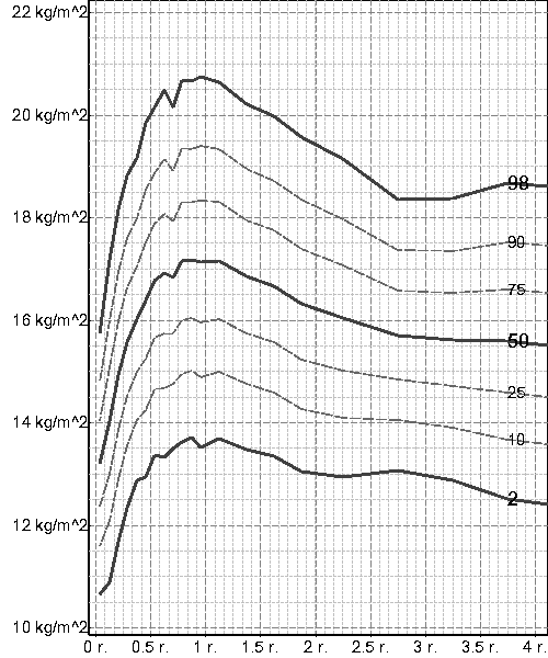 | Body mass index (kg/m^2) Kalendářní věk | ||